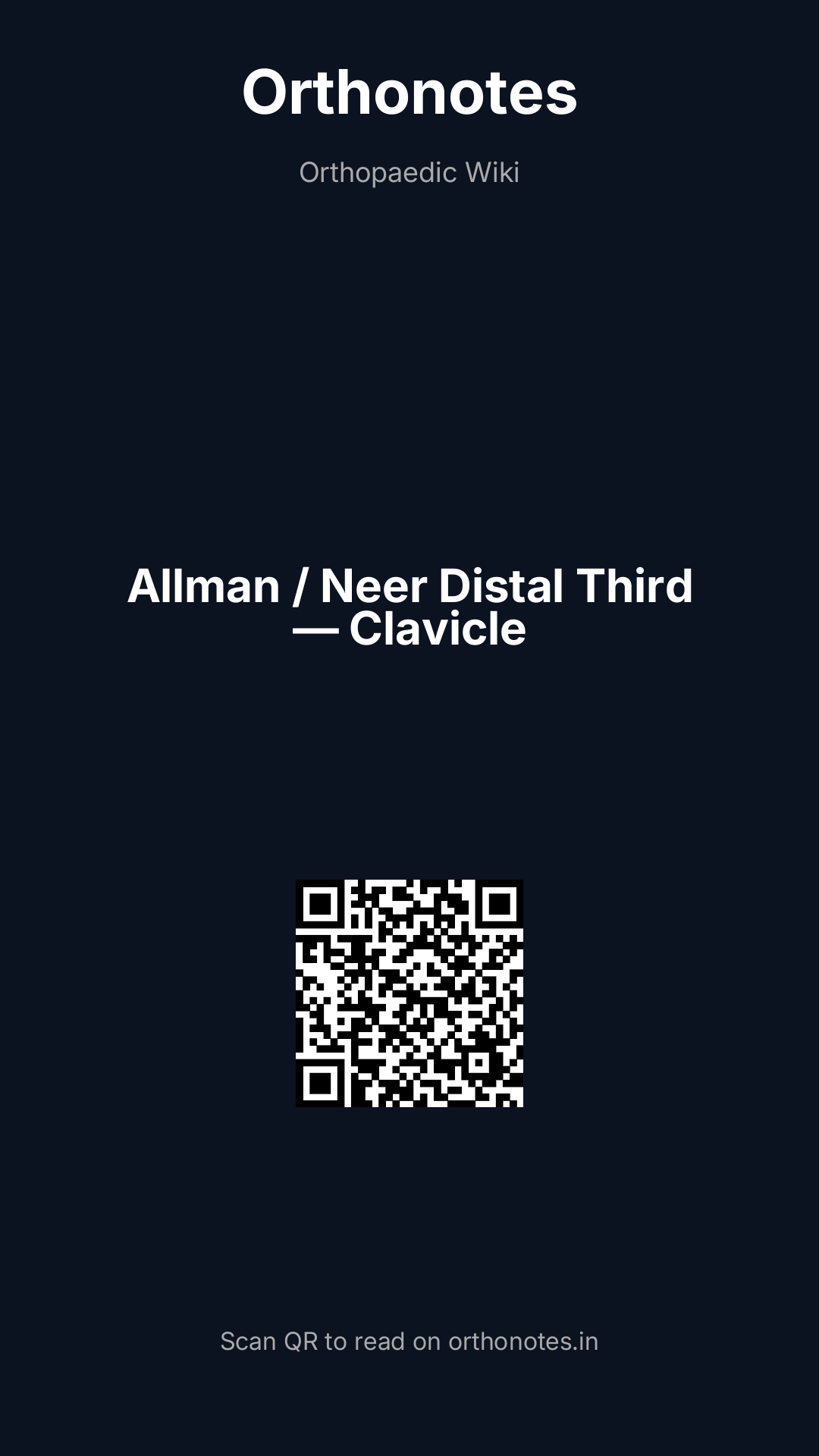 Allman: Type I midshaft; Type II distal; Type III medial third. Neer distal clavicle: Type I stable; IIA/IIB unstable (CC ligaments disrupted); Type III intra-articular; V epiphyseal. Distal (Neer IIB) has high nonunion; often operative.