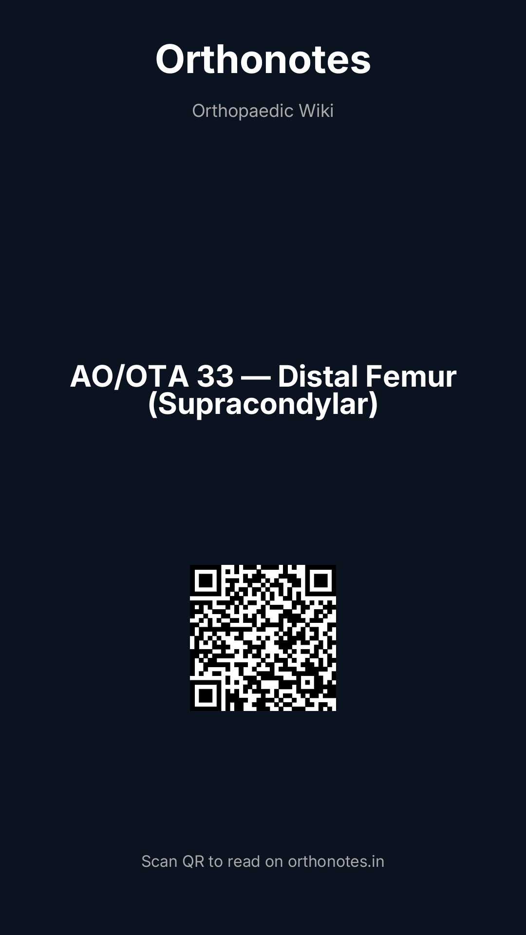 Distal femur fractures (supracondylar and intercondylar fractures) present in a bimodal distribution: high-energy injuries in young adults (road traffic accidents, sports) and low-energy fractures in osteoporotic elderly patients (particularly those with periprosthetic fractures around a knee arthroplasty). They represent approximately 4–7% of all femoral fractures and carry significant morbidity from stiffness, malunion, non-union, and post-traumatic arthritis. The AO/OTA classification using code 33 (3 = femur; 3 = distal segment) is the standard classification for distal femur fractures, dividing them into extra-articular (33-A), partial articular (33-B), and complete articular (33-C) types — providing a comprehensive and reproducible description that guides surgical planning.