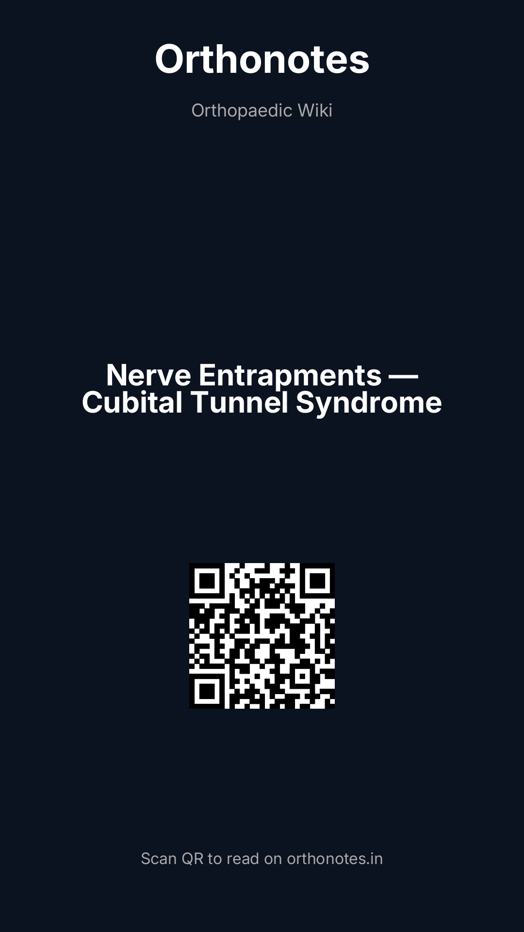 Cubital tunnel syndrome is the second most common peripheral nerve entrapment neuropathy after carpal tunnel syndrome, involving compression of the ulnar nerve at the elbow. The ulnar nerve is vulnerable at the cubital tunnel — the fibro-osseous canal posterior to the medial epicondyle — where it is tethered, relatively superficial, and subjected to significant tension and compression, particularly during elbow flexion. Understanding the anatomy, sites of compression, clinical grading, and surgical options is essential for the orthopaedic surgeon.