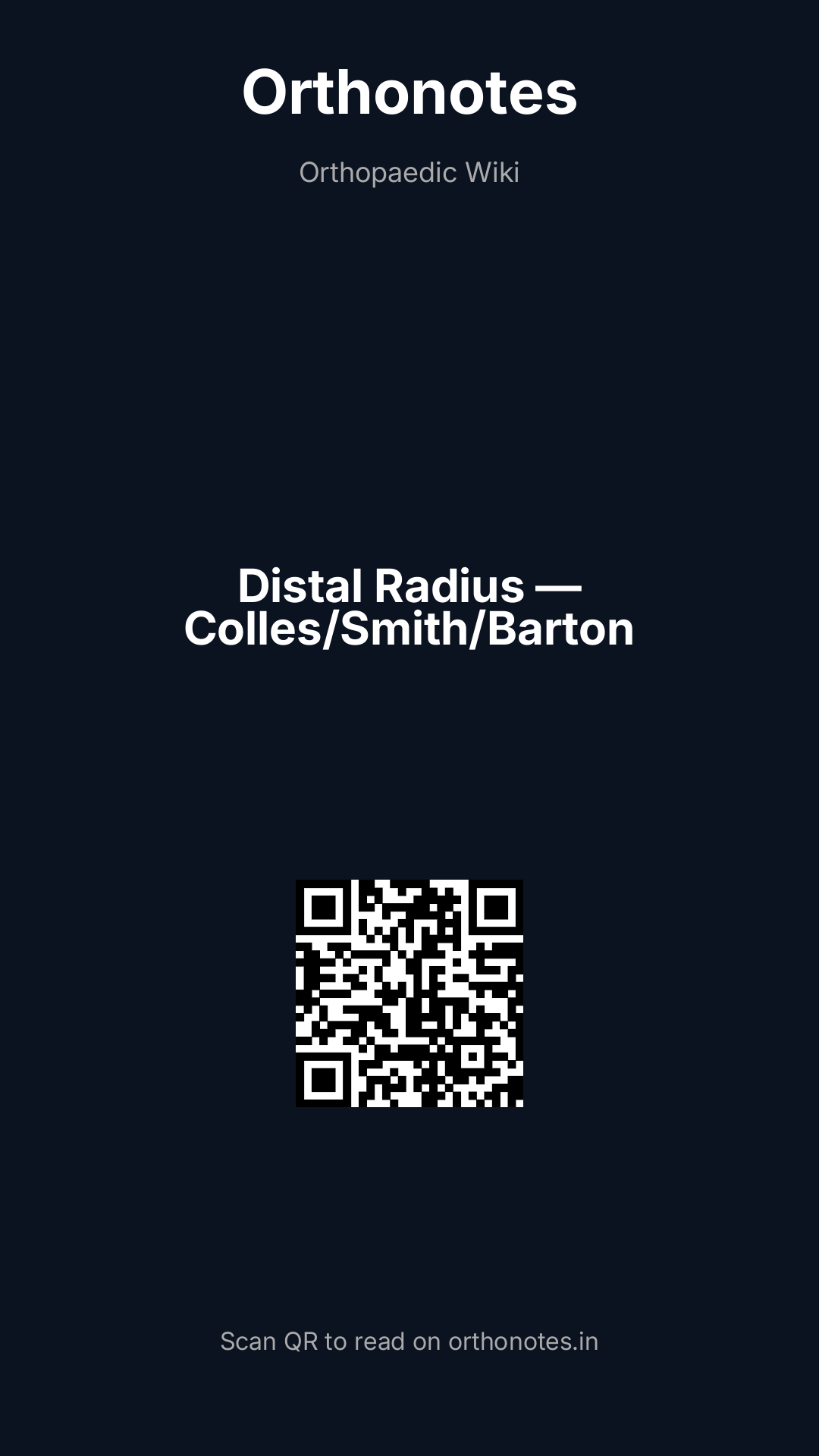 Distal radius fractures are the most common fractures seen in the emergency department, accounting for approximately 17% of all fractures. They affect two distinct populations: young adults sustaining high-energy trauma, and elderly patients (predominantly post-menopausal women) sustaining low-energy falls — the latter representing an osteoporotic fragility fracture. The eponymous fractures — Colles`, Smith`s, and Barton`s — describe specific fracture patterns based on the mechanism and displacement, each with distinct clinical and radiological features and management implications.