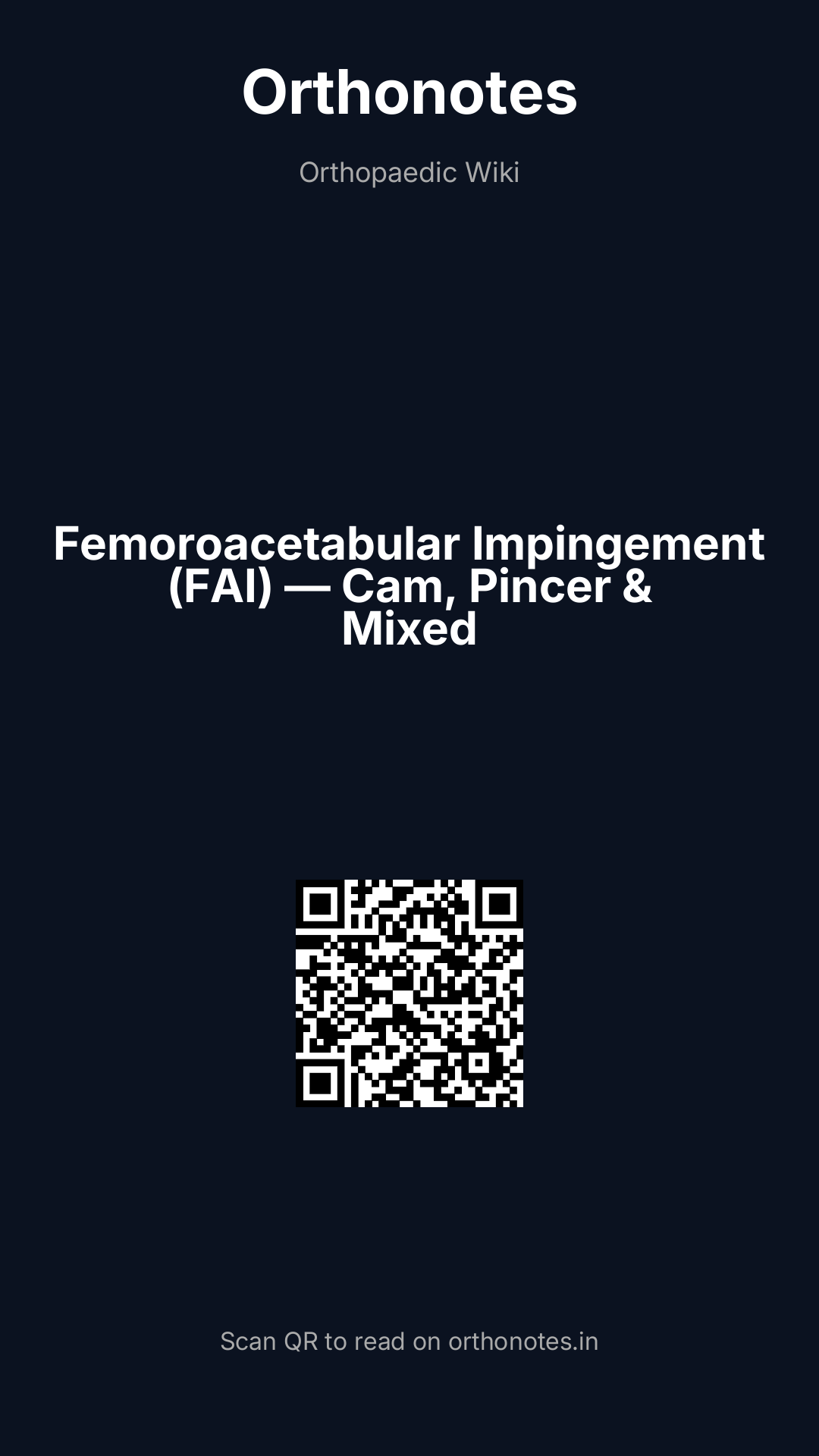 Femoroacetabular impingement (FAI) is a motion-related clinical disorder of the hip resulting from premature or repetitive contact between the proximal femur and the acetabular rim during terminal ranges of hip motion. It is among the most common causes of hip pain in young active adults and is now recognised as a leading cause of hip osteoarthritis, particularly in the non-dysplastic hip. FAI was formally described and classified by Ganz and colleagues in 2003, transforming understanding of hip mechanics and triggering a revolution in hip preservation surgery. The condition produces characteristic patterns of labral tearing and cartilage damage at the anterosuperior acetabulum — the primary zone of impingement contact — and if untreated leads to progressive chondral loss and secondary osteoarthritis.