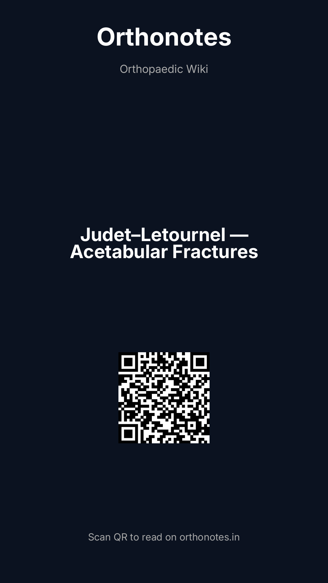 Acetabular fractures are complex intra-articular injuries requiring highly specialised surgical expertise for management. They occur from high-energy trauma (road traffic accidents, falls from height) — with the femoral head being driven into the acetabulum by the axial force transmitted through the femur. The Judet-Letournel classification, developed by Robert Judet, Jean Judet, and Émile Letournel in their landmark 1964 and 1993 publications, is the universal standard for describing acetabular fractures. Understanding this classification requires a thorough grasp of the two-column concept of the acetabulum — the foundation on which the entire classification is built. Acetabular ORIF is one of the most technically demanding procedures in orthopaedics, requiring understanding of three-dimensional anatomy, specialised approaches, and precise fluoroscopic control.