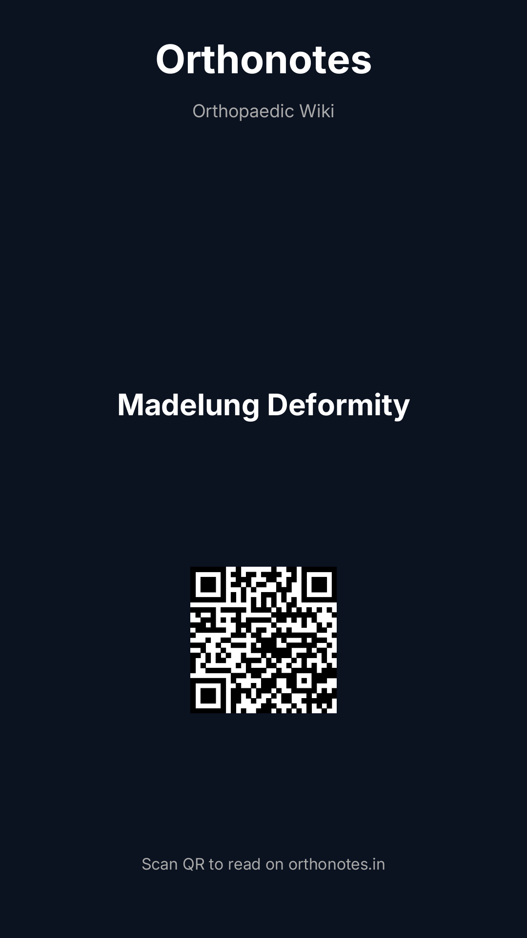 Madelung deformity is a rare congenital and developmental deformity of the wrist characterised by premature partial physeal arrest of the volar-ulnar aspect of the distal radial physis, leading to a characteristic triad of volar and ulnar bowing of the radius, dorsal subluxation of the distal ulna (prominent ulnar head), and carpal wedging (the proximal carpus adopts a triangular configuration between the radius and the dorsally subluxed ulna). It results in a characteristic cosmetic deformity as well as wrist pain, loss of forearm rotation, and reduced grip strength.
