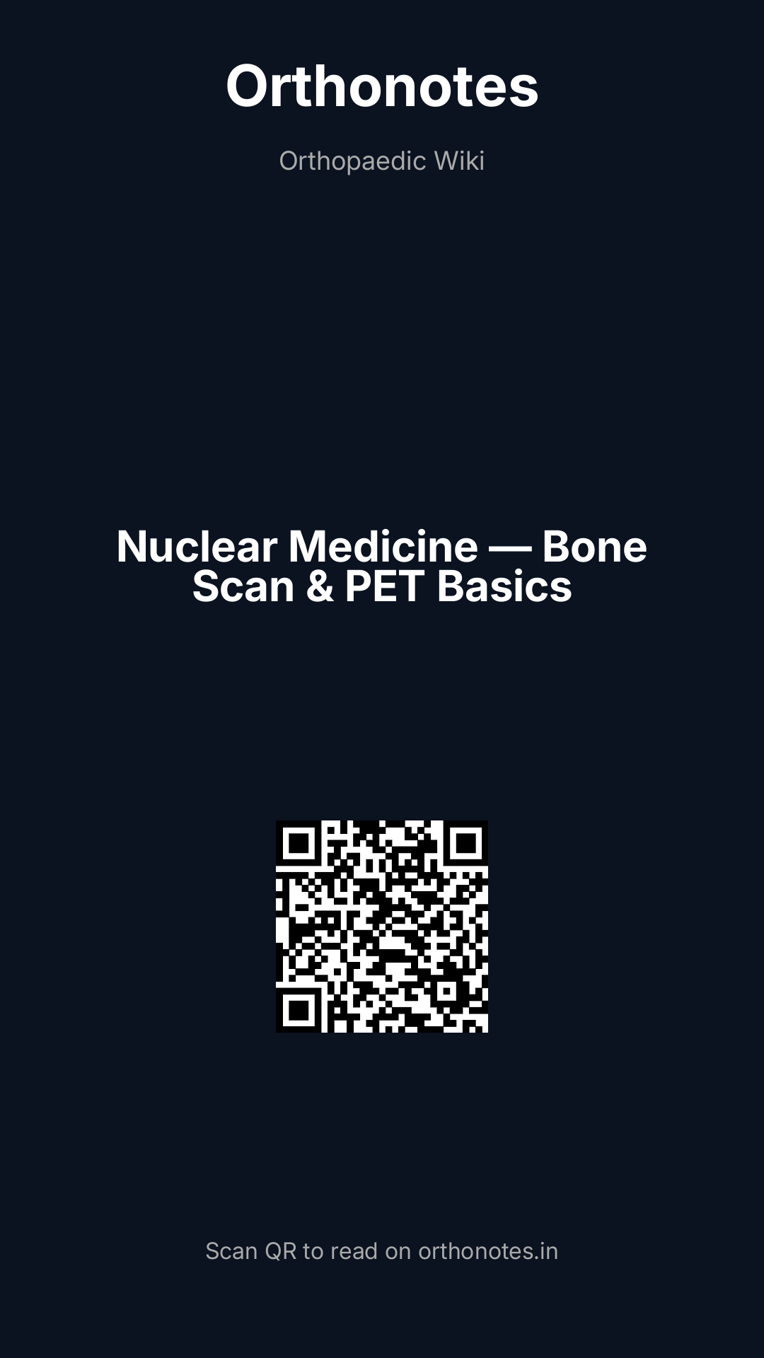 Nuclear medicine imaging uses radioactive tracers (radiopharmaceuticals) administered to the patient, which accumulate in specific tissues based on physiological activity; the emitted gamma radiation is detected by a gamma camera to produce images reflecting metabolic and physiological processes rather than anatomy alone. In orthopaedics, nuclear medicine has three principal applications: the technetium-99m (Tc-99m) bone scan for identifying areas of increased bone turnover, the labelled white cell scan (WBC scan) for detecting infection, and positron emission tomography (PET) — increasingly combined with CT (PET-CT) or MRI (PET-MRI) — for tumour staging, infection diagnosis, and monitoring treatment response.