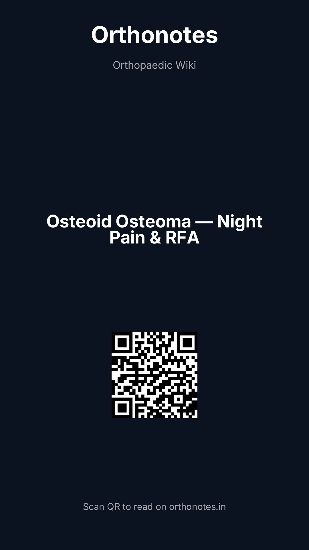 Benign osteoblastic tumor <2 cm nidus, surrounded by reactive sclerosis. Classical symptom: severe night pain relieved by NSAIDs. Common sites: femur, tibia diaphysis; spine (posterior elements) may cause painful scoliosis. X‑ray: radiolucent nidus with central calcification, cortical thickening. Treatment: CT‑guided radiofrequency ablation is gold standard; surgical excision if RFA not feasible.