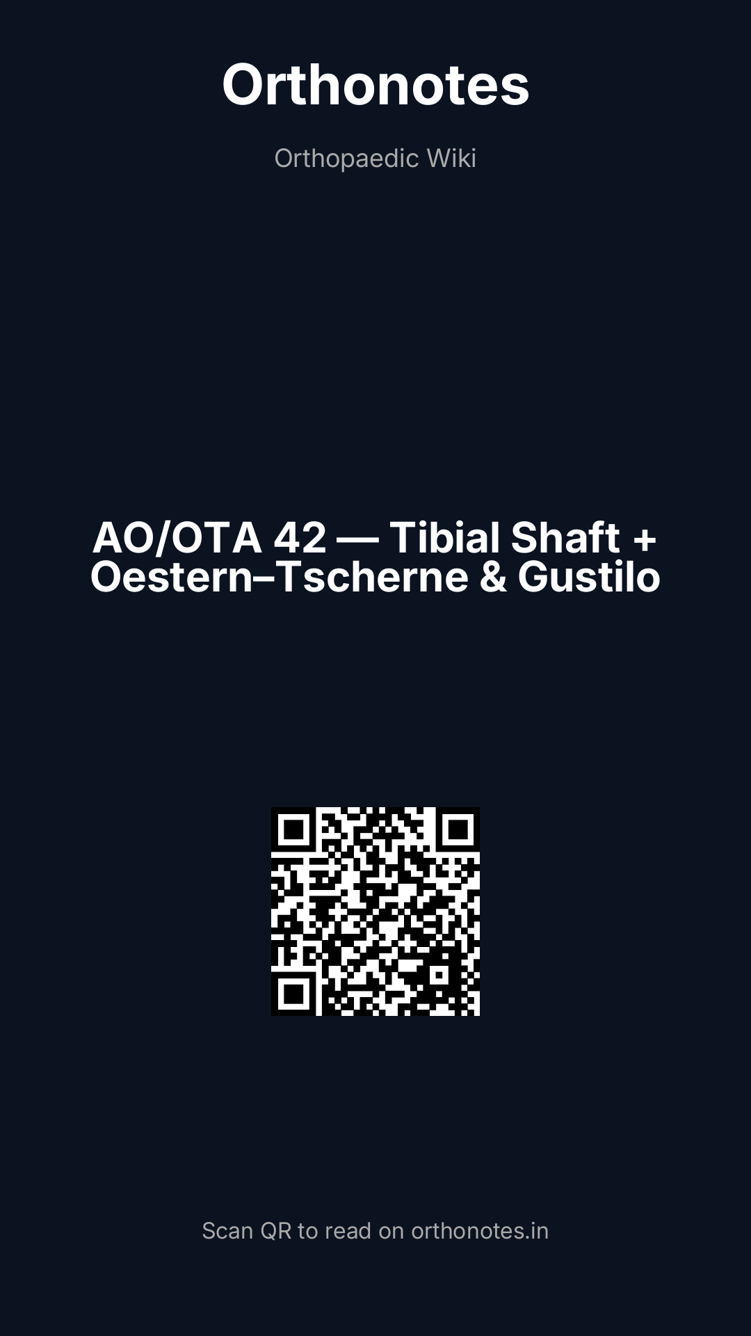 Tibial shaft fractures are the most common long bone fractures requiring hospital admission, with an annual incidence of approximately 17 per 100,000 population. The tibia is particularly vulnerable to open injury because of its subcutaneous anteromedial surface — it has the thinnest soft tissue coverage of any long bone, making it the most common site for open fractures. Tibial shaft fractures present a wide spectrum — from undisplaced stress fractures in athletes to high-energy open fractures with severe soft tissue destruction in polytrauma patients. Comprehensive classification requires addressing three distinct dimensions: (1) the bony fracture morphology (AO/OTA 42 classification); (2) the soft tissue injury in open fractures (Gustilo-Anderson classification); and (3) the soft tissue injury in closed fractures (Tscherne-Oestern classification).