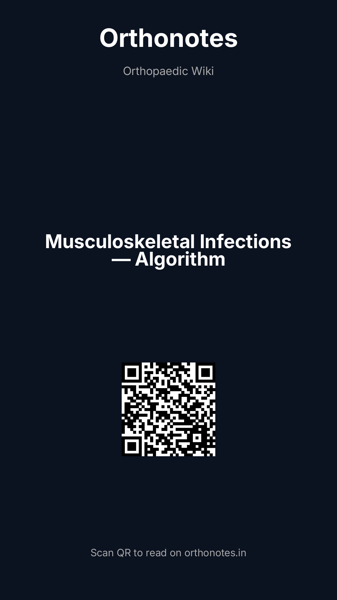 Musculoskeletal (MSK) infections encompass a broad spectrum of conditions including acute haematogenous osteomyelitis, septic arthritis, discitis, psoas abscess, infected prosthetic joints, necrotising fasciitis, and diabetic foot infections. A systematic algorithmic approach to diagnosis and management is essential because delays in treatment lead to irreversible joint destruction, avascular necrosis, chronic osteomyelitis, and life-threatening sepsis. The fundamental principle is: suspect infection early, investigate promptly, and treat aggressively.