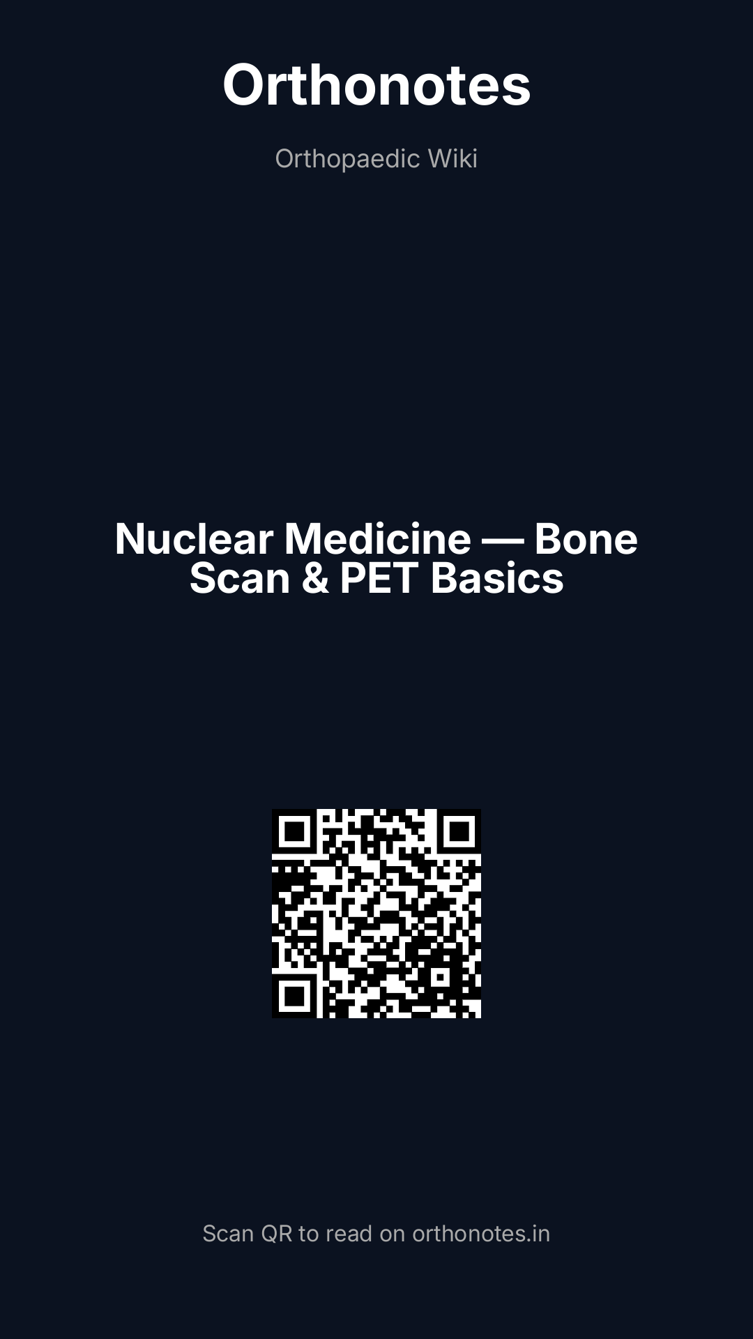 Nuclear medicine imaging uses radioactive tracers (radiopharmaceuticals) administered to the patient, which accumulate in specific tissues based on physiological activity; the emitted gamma radiation is detected by a gamma camera to produce images reflecting metabolic and physiological processes rather than anatomy alone. In orthopaedics, nuclear medicine has three principal applications: the technetium-99m (Tc-99m) bone scan for identifying areas of increased bone turnover, the labelled white cell scan (WBC scan) for detecting infection, and positron emission tomography (PET) — increasingly combined with CT (PET-CT) or MRI (PET-MRI) — for tumour staging, infection diagnosis, and monitoring treatment response.