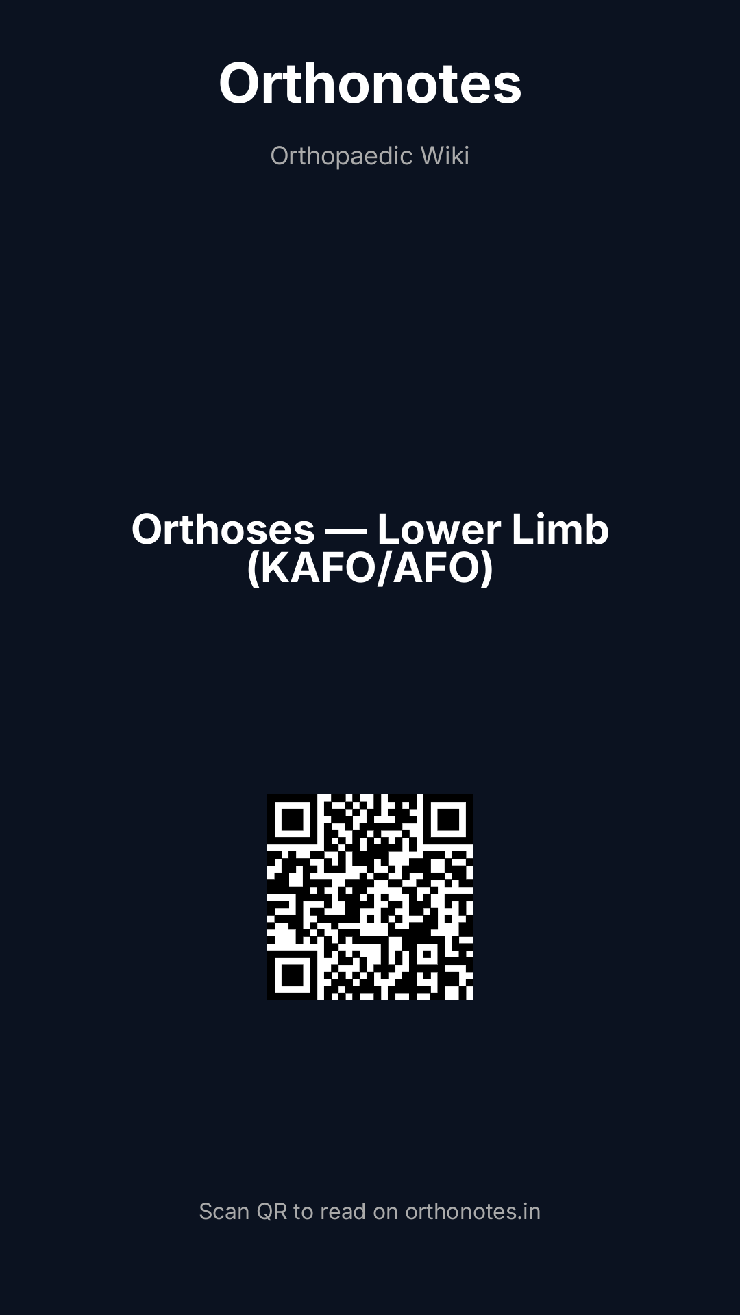 Orthoses are external devices applied to the body to support, align, prevent deformity, assist function, or offload specific anatomical structures. Lower limb orthoses range from simple insoles and ankle supports to complex knee-ankle-foot orthoses (KAFOs) used for paralytic conditions. A thorough understanding of the biomechanical principles, terminology, indications, and limitations of the most clinically relevant lower limb orthoses — the ankle-foot orthosis (AFO) and the knee-ankle-foot orthosis (KAFO) — is essential for orthopaedic surgeons involved in the rehabilitation of patients with neurological, musculoskeletal, and congenital conditions.