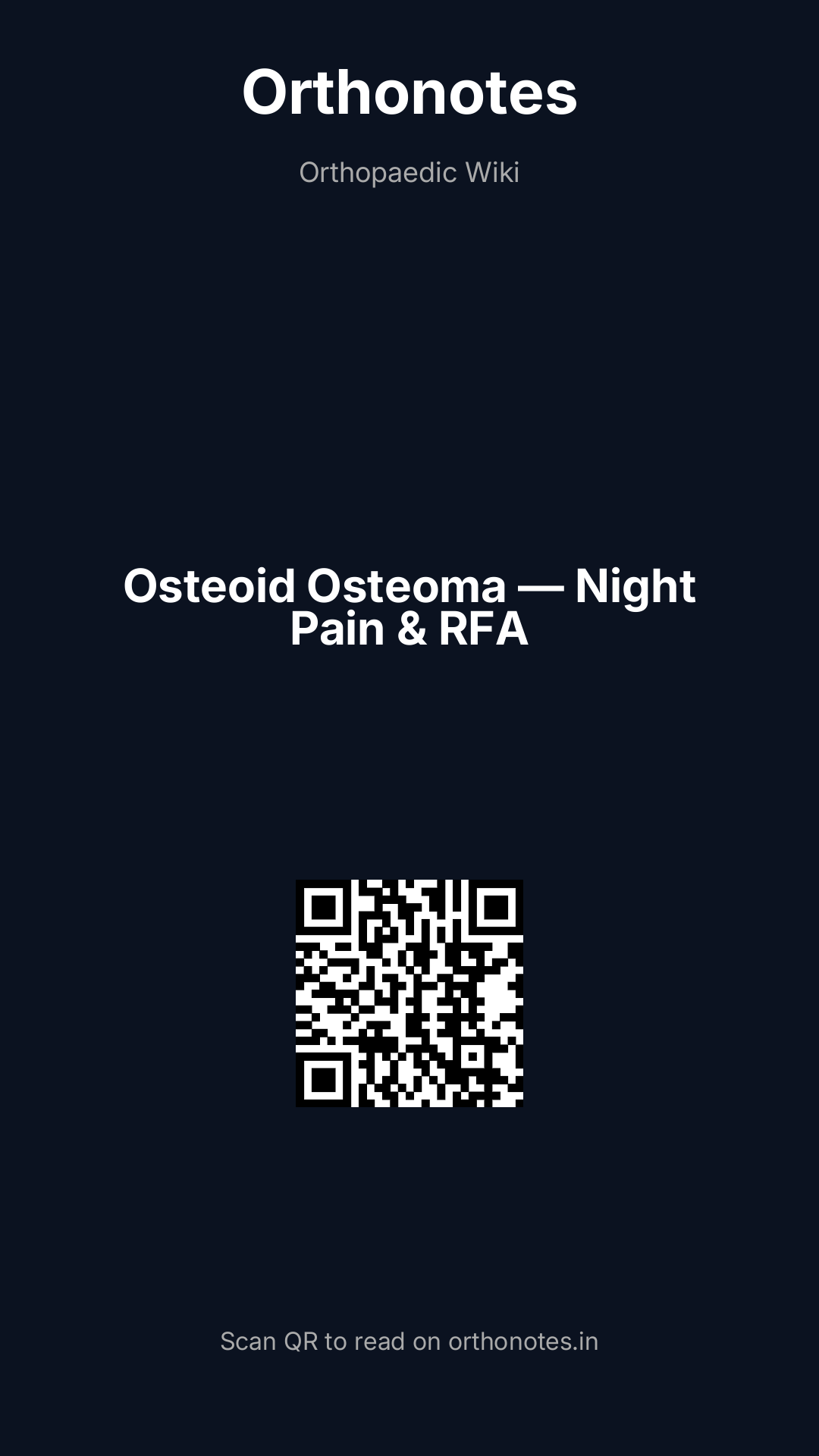 - Surgical excision: historically the standard treatment; now reserved for lesions not suitable for RFA (proximity to neural structures, failed RFA, technically inaccessible) or when a tissue diagnosis is required; en bloc excision of the nidus through an open or arthroscopic approach; the reactive sclerotic bone does not need to be excised — only the nidus; confirmation of complete nidus excision can be performed with intraoperative X-ray or fluoroscopy; incomplete excision results in recurrence