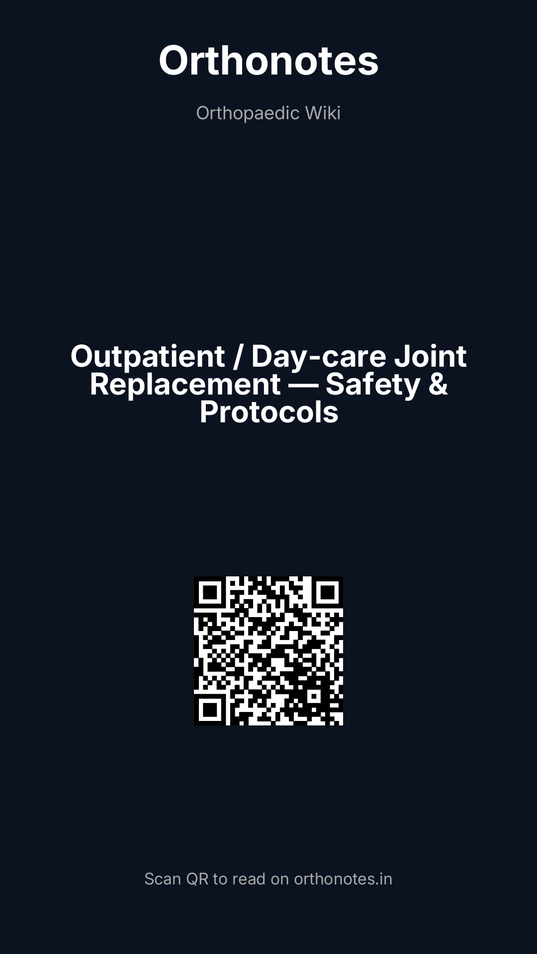 Outpatient (same-day discharge) and day-care joint replacement — performing total hip arthroplasty (THA) or total knee arthroplasty (TKA) with discharge on the day of surgery or within 23 hours — has emerged as a safe and cost-effective alternative to traditional inpatient joint replacement for carefully selected patients. Driven by advances in multimodal analgesia, regional anaesthesia, surgical efficiency, and enhanced recovery protocols, outpatient joint replacement has grown substantially in the USA and increasingly in the UK and Europe. The key principles are appropriate patient selection, optimised perioperative pathways, robust social support, and clear criteria-based discharge rather than time-based discharge.