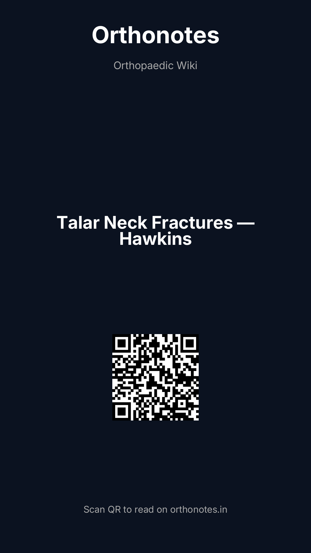 The Hawkins classification system is widely used to categorize talar neck fractures and predict the risk of avascular necrosis. Early diagnosis and appropriate surgical management are essential to restore joint congruity and minimize long-term complications.